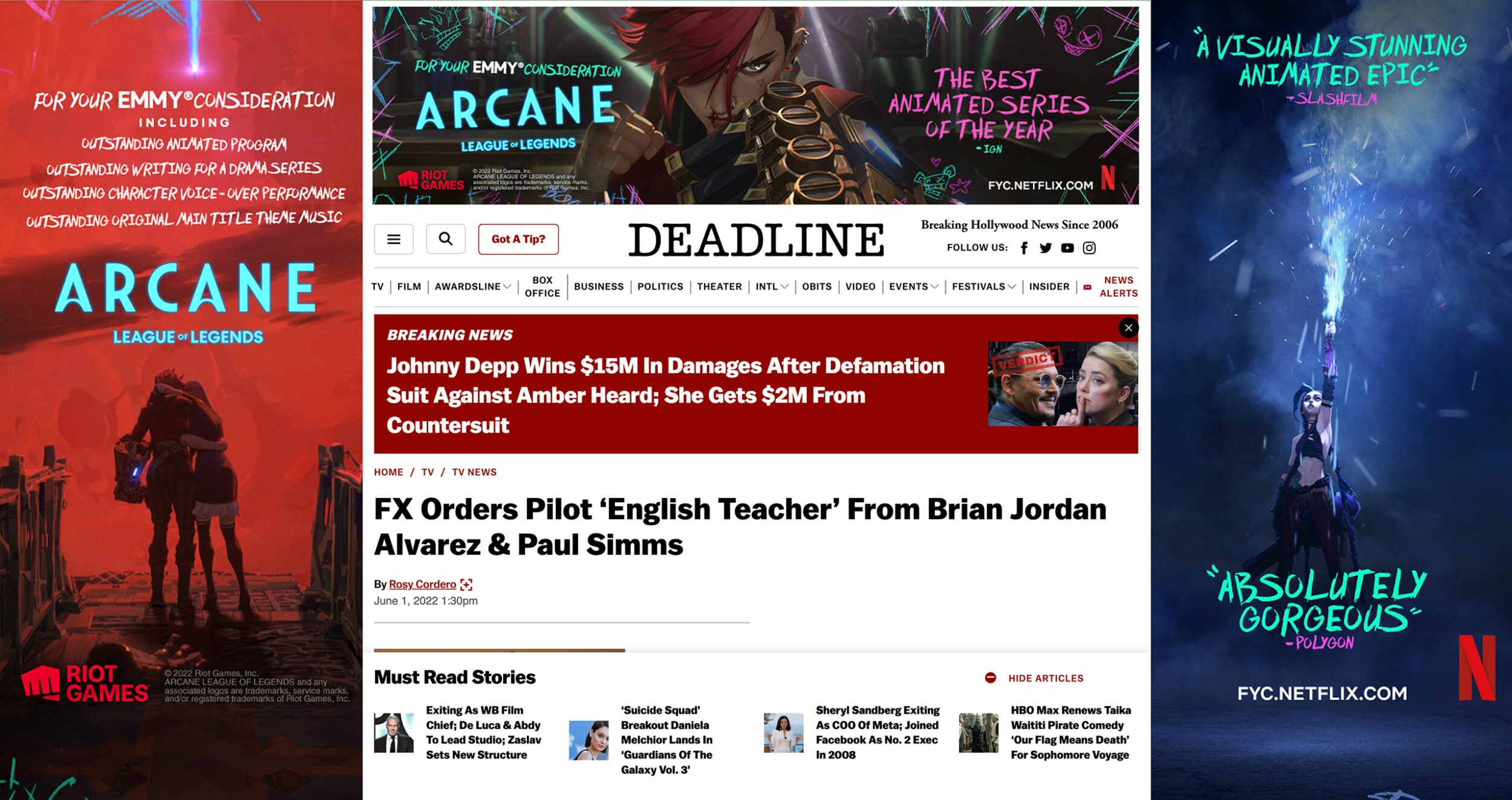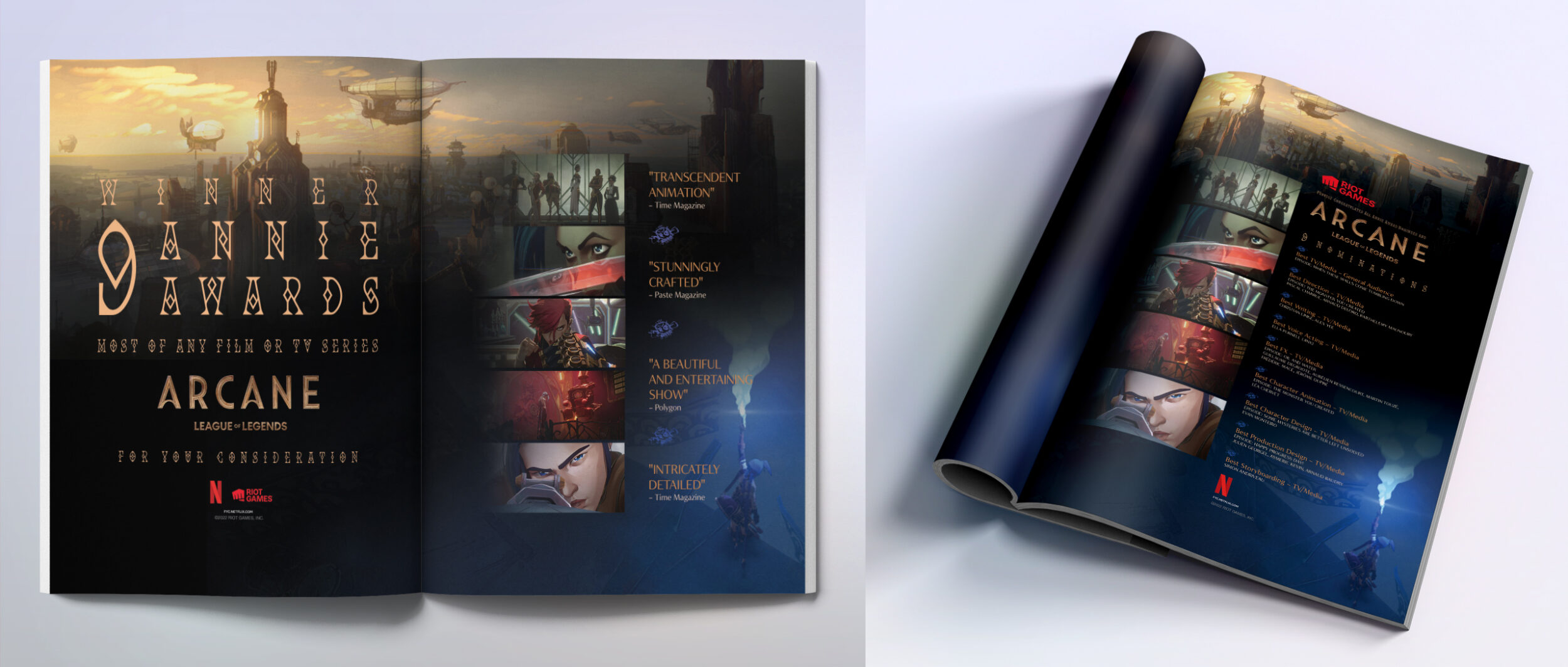 Our awards campaign began conservatively with a few print spreads for the Annie Awards. When Arcane won a stunning 9 Annie Awards–more than any film or TV series, winning in each category it was nominated for–we quickly extended our awards campaign to produce a suite of assets for Emmy consideration, including OOH, digital takeovers, banners, social.