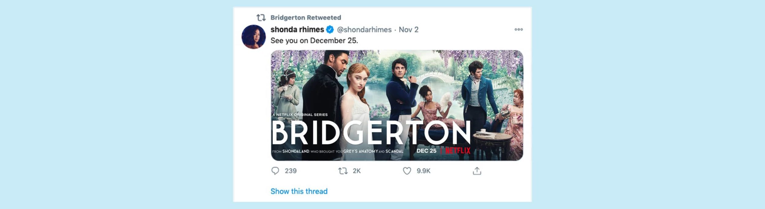 Period pieces have emerged as a genre in their own across the streaming landscape. The genre has a core audience but is rejected among a non-period piece streaming audience that feels this type of content isn’t for them. Our challenge was to bring Bridgerton to life as so much more, backed by the recently announced partnership between Netflix and Shonda Rhimes.